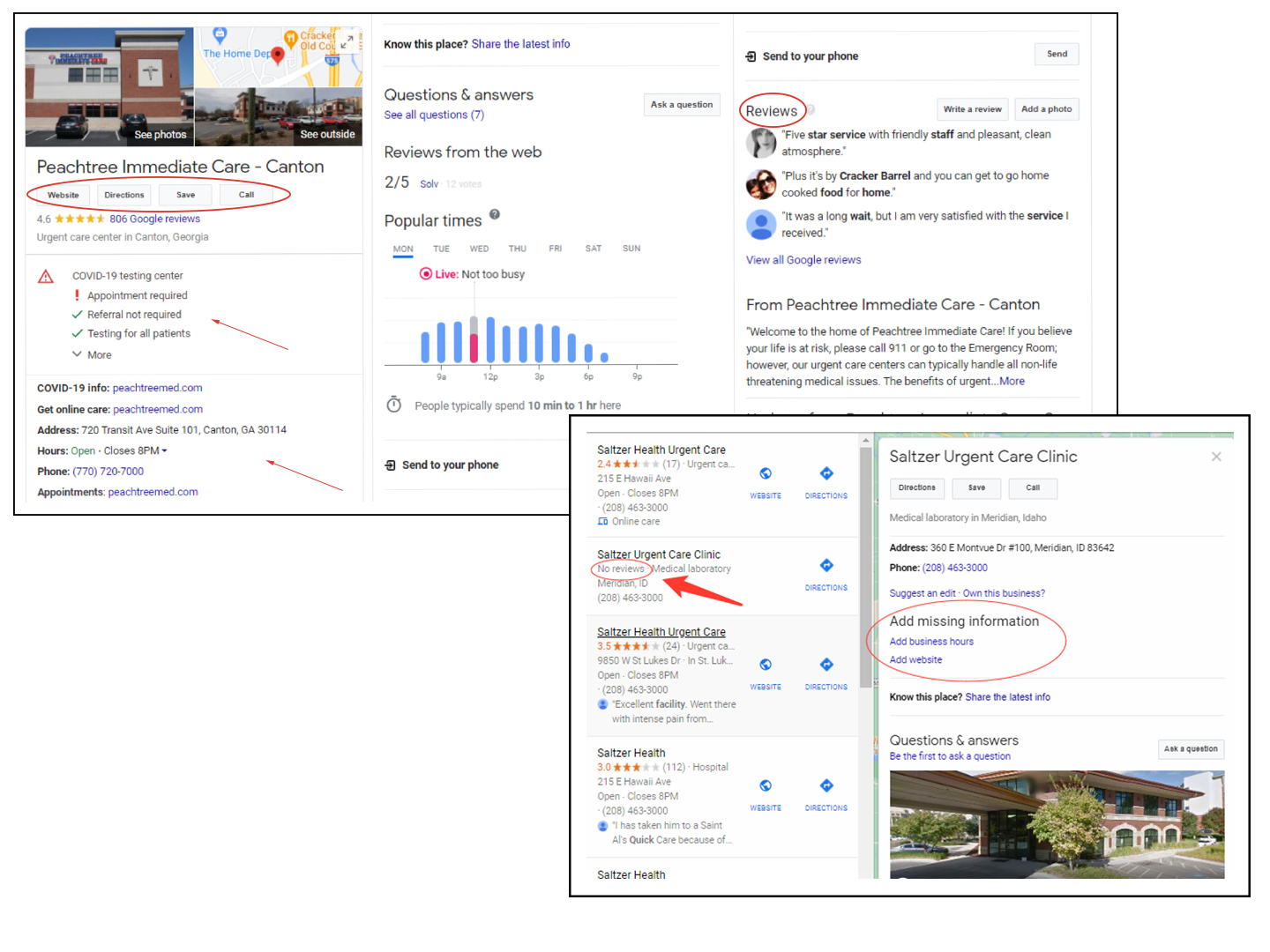 Here are examples of some healthcare providers’ GMB listings with varying levels of information. If your kid was sick or you just cut your thumb open slicing a bagel, which listing inspires trust and action on your part?
