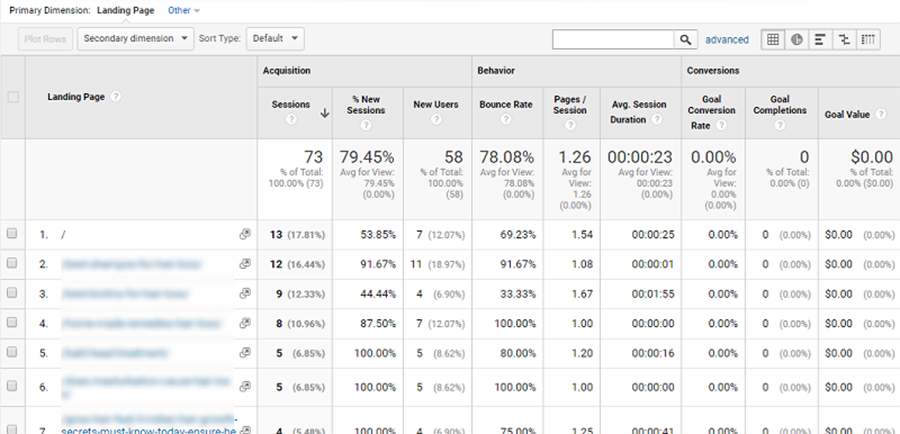 Landing pages also show you conversion rates broken down by page. You’ll see the most popular landing pages on your website, arranged by the number of visitors that have landed on each page over the specified period. It’ll look like this: