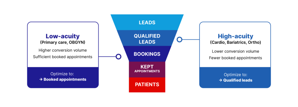 High-acuity services like Cardiology get 10-15 booked appointments per month. If you tell Google Ads to optimize to kept appointments or new patient status, you’re starving the algorithm of data. It can’t learn from only three data points per month.